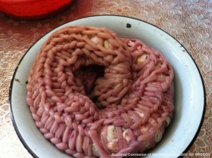 В последние годы стало модным заполнять не только кишку, но и бараний желудок, и выкладывать его на стол в виде утки. После того, как кишку или желудок забивают фаршем, колбасу отваривают в бульоне около 1-1,5 часов.